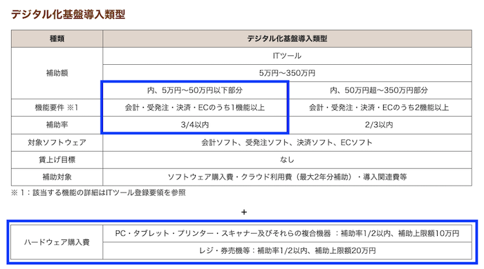 今回StoreTouchのPOSレジについては、「デジタル化基盤導入類型」の補助率「3/4」の上限50万円のカテゴリーに入ると思われます。